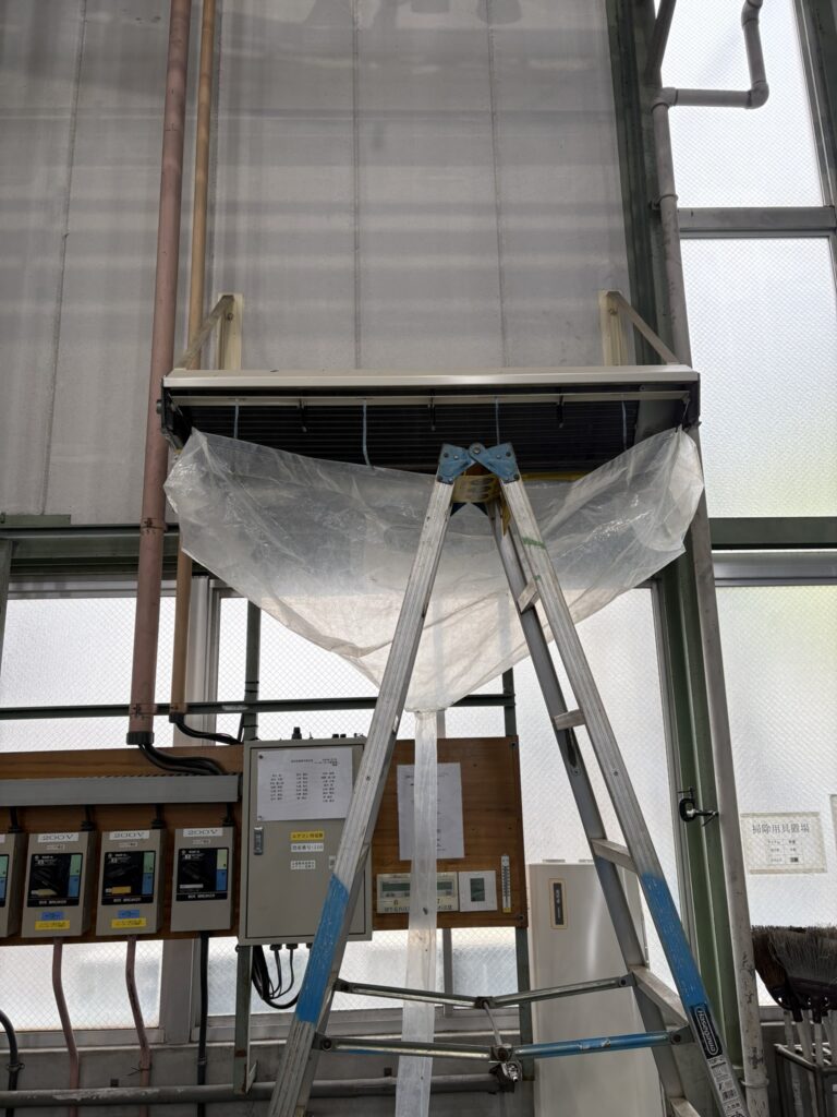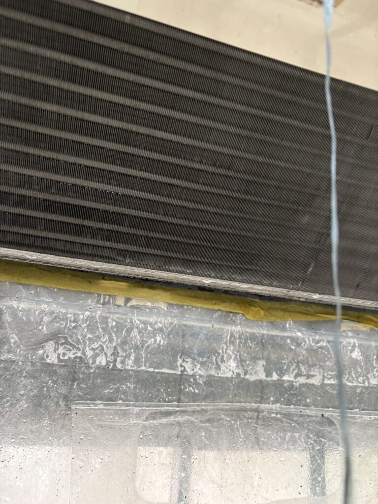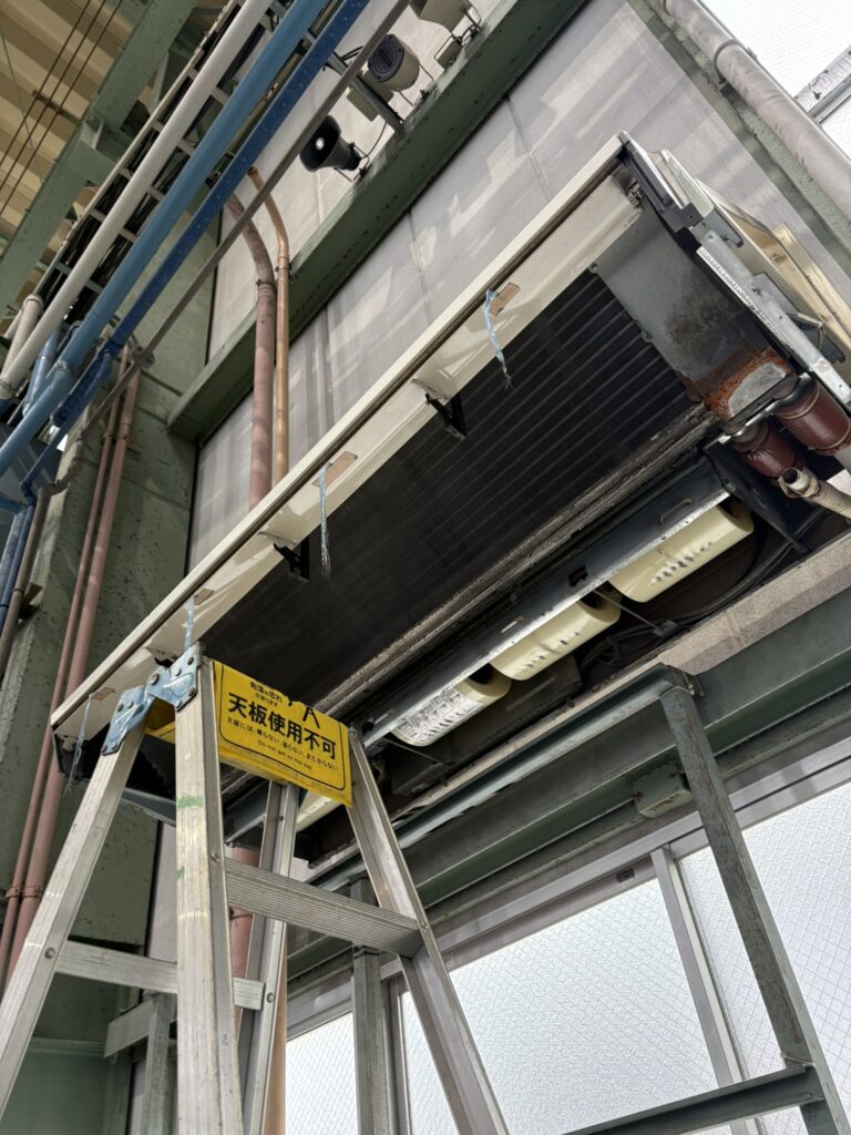 厚木市工場 三菱天吊り型エアコン洗浄工事 2026年2月8日 j4566745 ドレンパンを外した洗浄前です。工場なので粉塵を沢山吸い込んでドレンパンに蓄積しています。 このように、分解して洗浄をいたします。全体に汚れています。 熱交換器の汚れは随分落ちたようです。 順番が逆になりましたが専用のホッパーで養生して洗浄していきます。 洗浄液をかけて洗っていきます。 真っ黒な液が出ました。この廃液が綺麗になるまで水洗いを何回も繰り返します。 最初のドレンパンも綺麗になりました。 エアコン洗浄工事は台数が有るのでしたら、工事費が安く出来ますのでご相談ください。